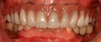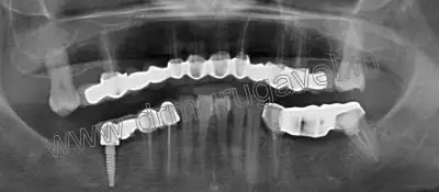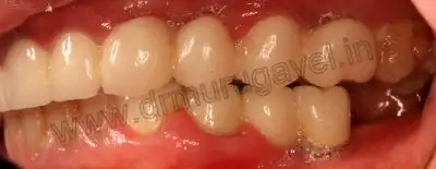 On examination gums was edematous and bleeding was present.Upper metal ceramic bridge was impinging on gums and food accumulation present..In Lower jaw,there is pain and mobility in relation 46 implant..Food accumulation present in relation to 34,35,36 bridge..