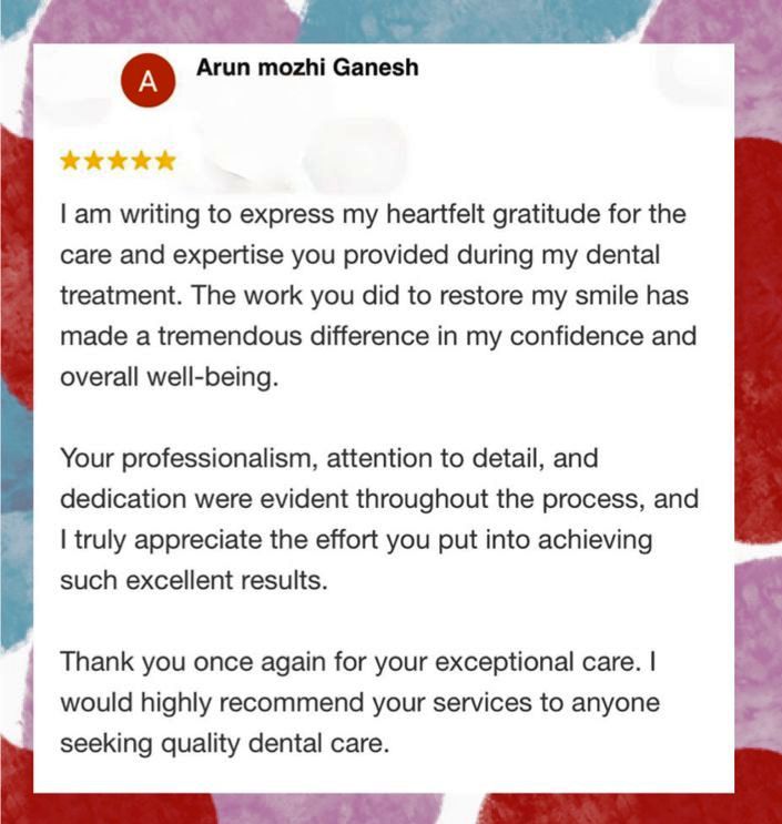 I am writing to express my heartfelt gratitude for the care and expertise you provided during my dental treatment. The work you did to restore my smile has made a tremendous difference in my confidence and overall well-being.