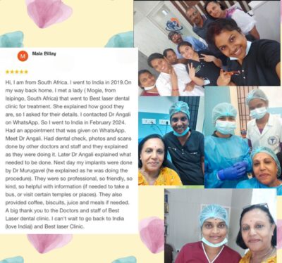 Hi, I am from South Africa. I went to India in 2019.On my way back home. I met a lady (Mogie, from Isipingo, South Africa) that went to Best laser dental clinic for treatment. She explained how good they are, so I asked for their details. I contacted Dr Angali on WhatsApp. So I went to India in February 2024. Had an appointment that was given on WhatsApp. Meet Dr Angali. Had dental check, photos and scans done by other doctors and staff and they explained as they were doing it. Later Dr Angali explained what needed to be done. Next day my implants were done by Dr Murugavel (he explained as he was doing the procedure). They were so professional, so friendly, so kind, so helpful with information (if needed to take a bus, or visit certain temples or places). They also provided coffee, biscuits, juice and meals if needed. A big thank you to the Doctors and staff of Best Laser dental clinic. I can’t wait to go back to India (love India)) and Best laser Clinic.