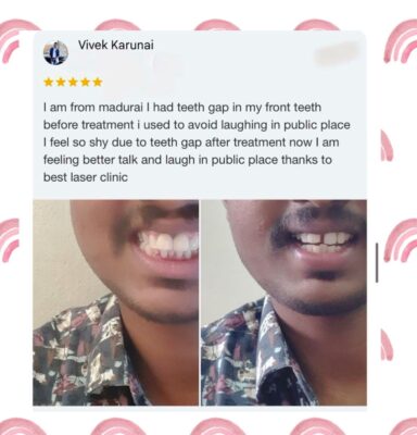 I am from madurai I had teeth gap in my front teeth before treatment i used to avoid laughing in public place I feel so shy due to teeth gap after treatment now I am feeling better talk and laugh in public place thanks to best laser clinic.